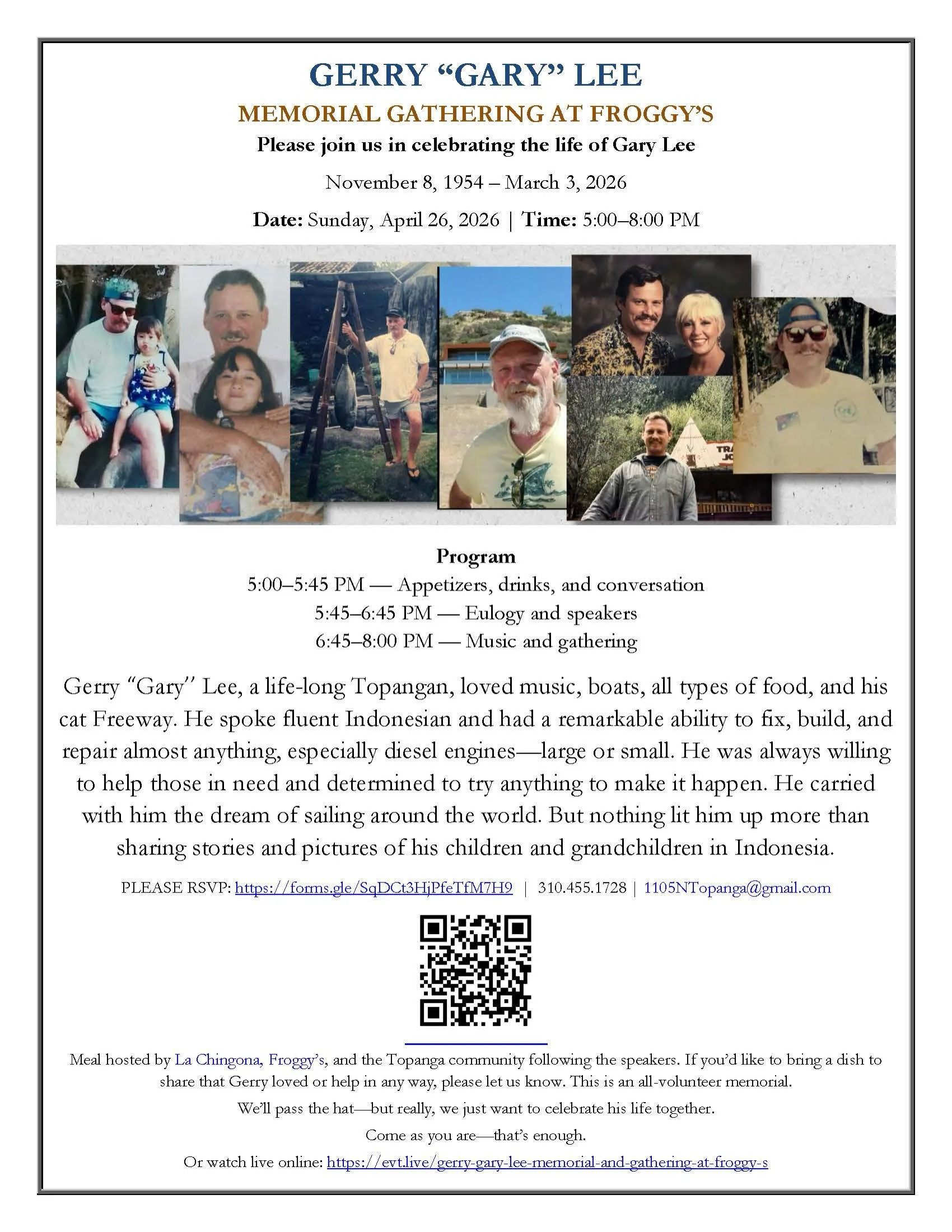Please save the date April 26, 2026 for Gary (aka Gerry) Lee’s Celebration of Life at Froggy’s